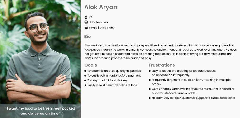 To better understand the users’ motivations, ambitions, and pain points, I created Alok Aryan, a user persona that would aid me in understanding the problems better and determining the essential features that should be included in the wibesite.