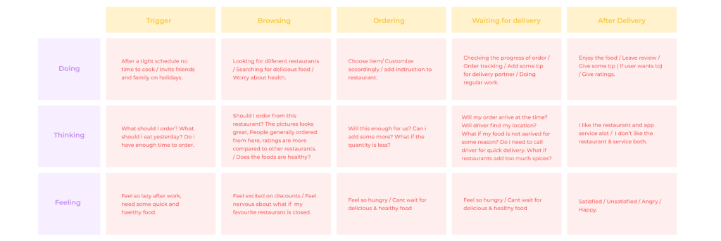 After talking with people about their experience and expectation about the food delivery app, I designed a Journey Mapping & Persona and figure out some pain & gain points and challenges faced by the users.
