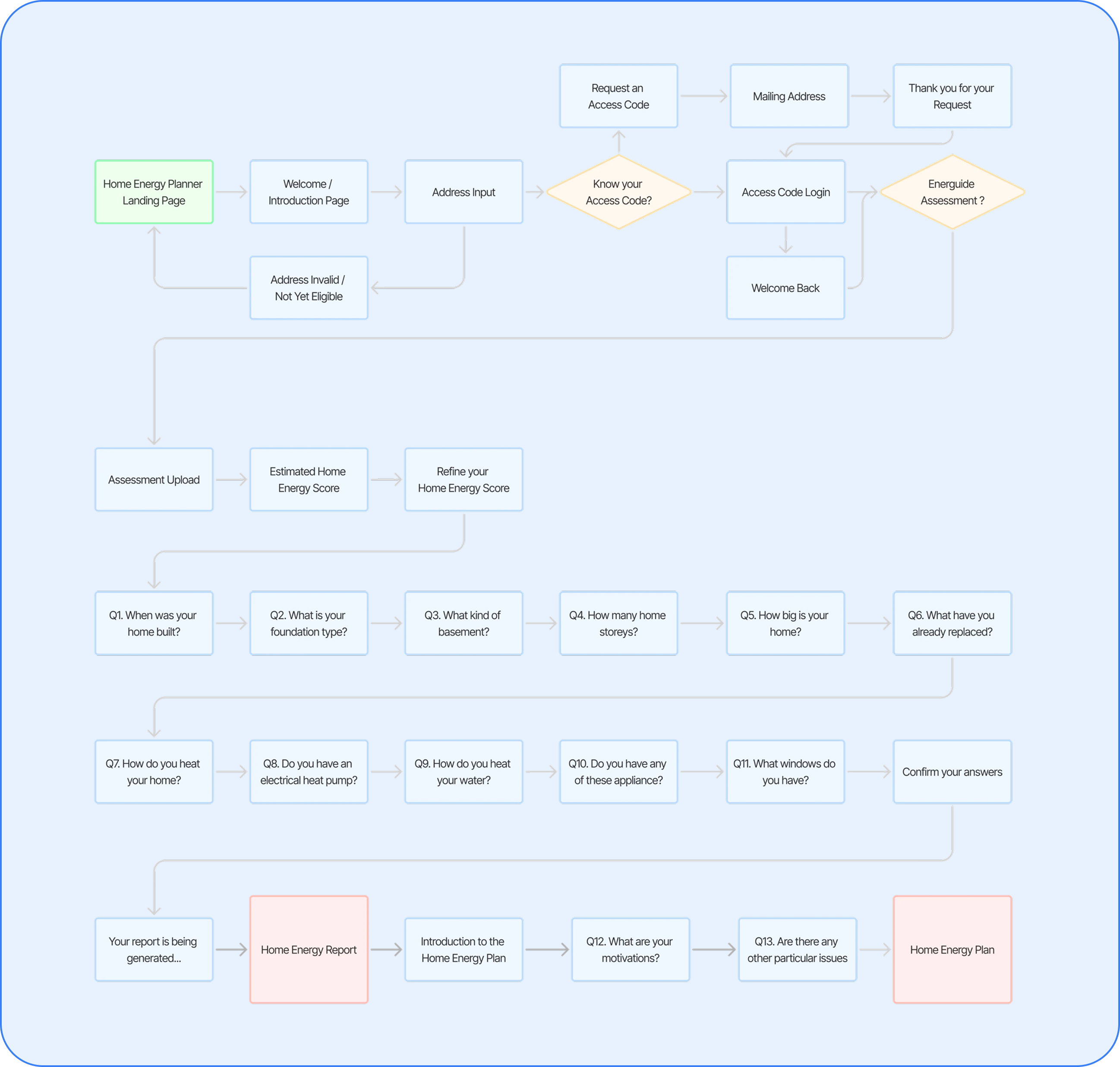 After multiple iterations and consultations with public sector stakeholders, as well as research into the underlying calculation model, alignment on the structure of the BC Home Energy Planner was reached and illustrated through an user flow.