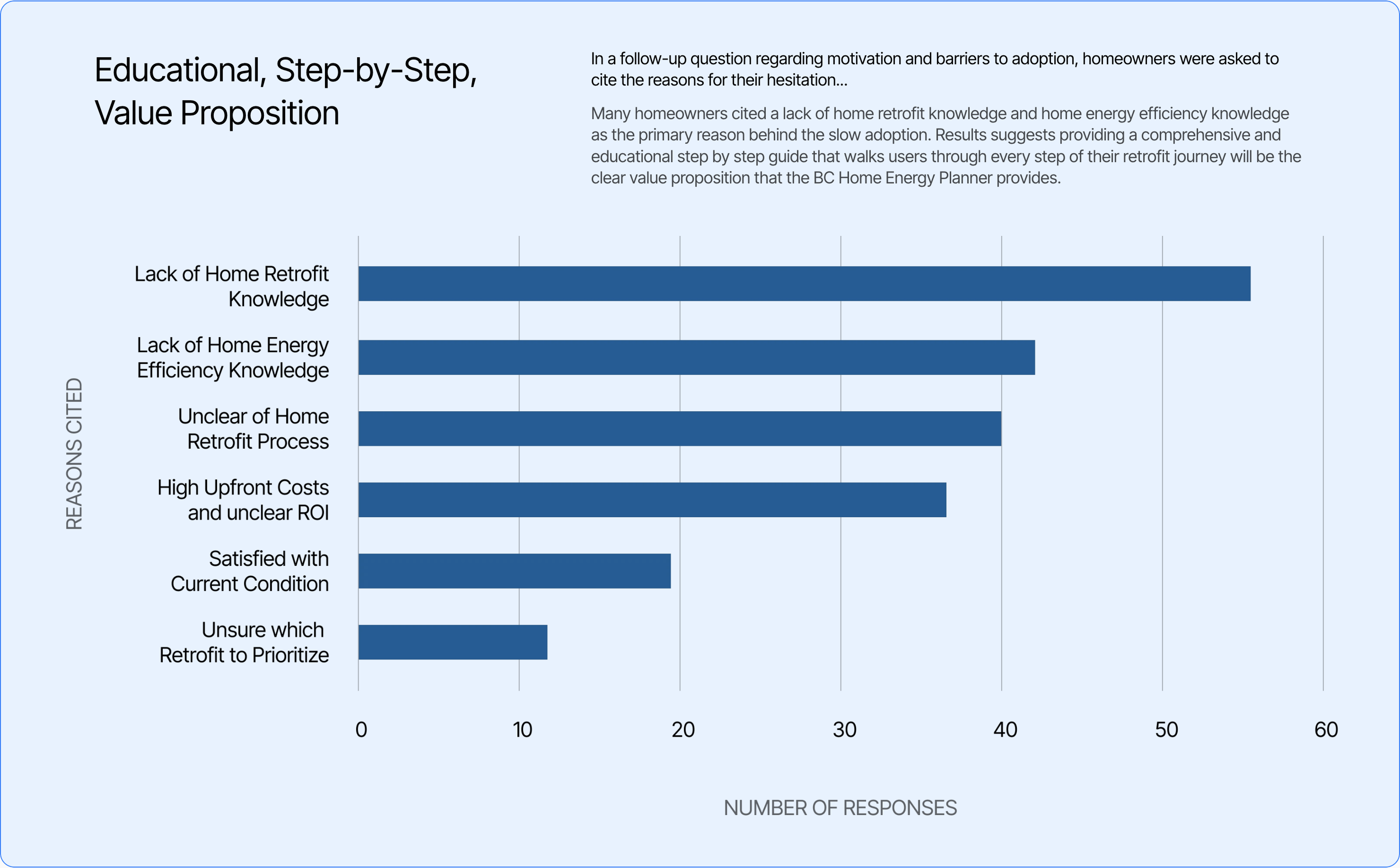 User surveys were conducted to inform the project kick-off. From the CleanBC Mailing List, participants were sent out a survey to assess their awareness surrounding retrofits and gauge the overall reception of this newly proposed service.