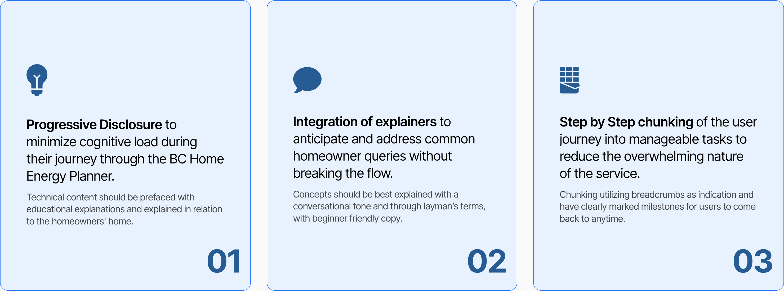 Given the insights from the user survey, I developed 3 core UX strategies that would inform my user flow and wireframe ideation, addressing the top 3 key reasons that is currently stopping BC homeowners to move forward with home retrofits.