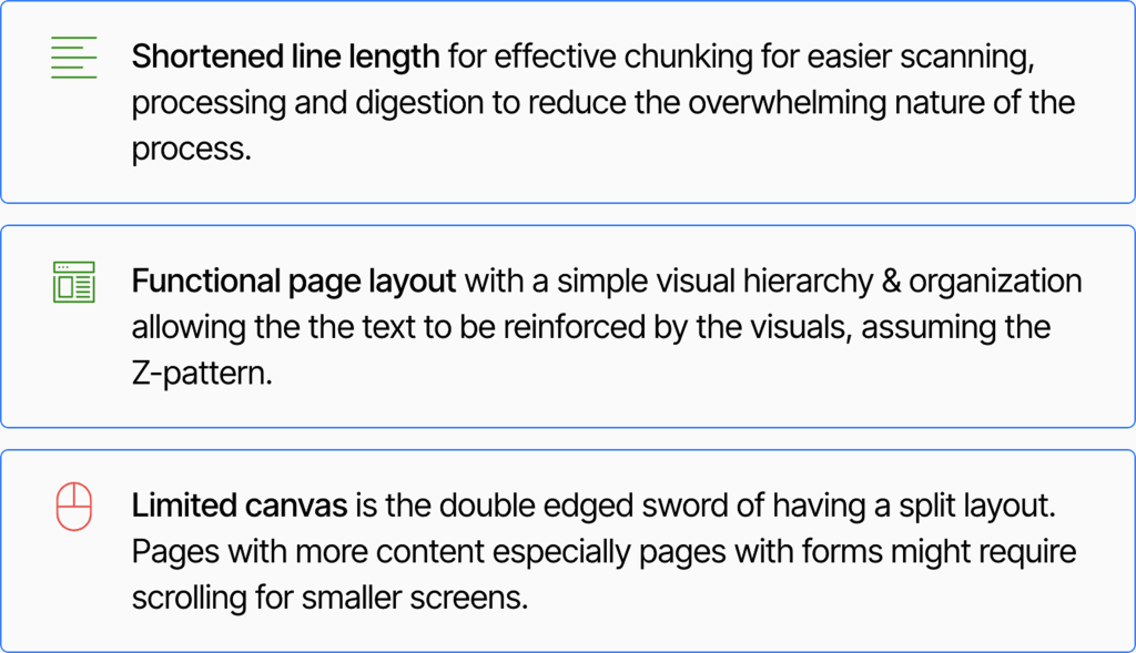 I used a classic split-screen layout to enhance readability and content flow. Instead of a balanced 50/50 split, I shifted the layout slightly in favor of the left content area to emphasize text over imagery, creating a clearer visual hierarchy.